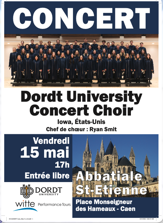 Dordt University Concert Choir est un ensemble issu d’une longue tradition d’excellence chorale. Véritable ambassadeur musical de Dordt University (Iowa, États-Unis), le chœur se produit régulièrement en tournée aux États-Unis, au Canada et en Europe, avec un répertoire varié issu de la musique chorale sacrée. Reconnu pour la qualité de ses interprétations, il met en valeur une grande diversité d’œuvres du répertoire choral. Sous la direction de Ryan Smit, ce concert gratuit est ouvert à tous.