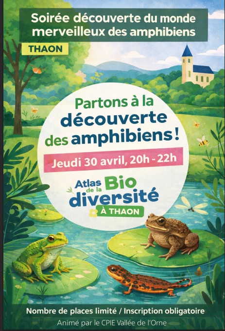 Animation. La soirée découverte du monde merveilleux des amphibiens organisée par CPIE, RV Médiathèque Thaon. Après une première partie en salle pour découvrir ces petites bêtes fascinantes, nous irons découvrir les tritons, crapauds , grenouilles de Thaon.