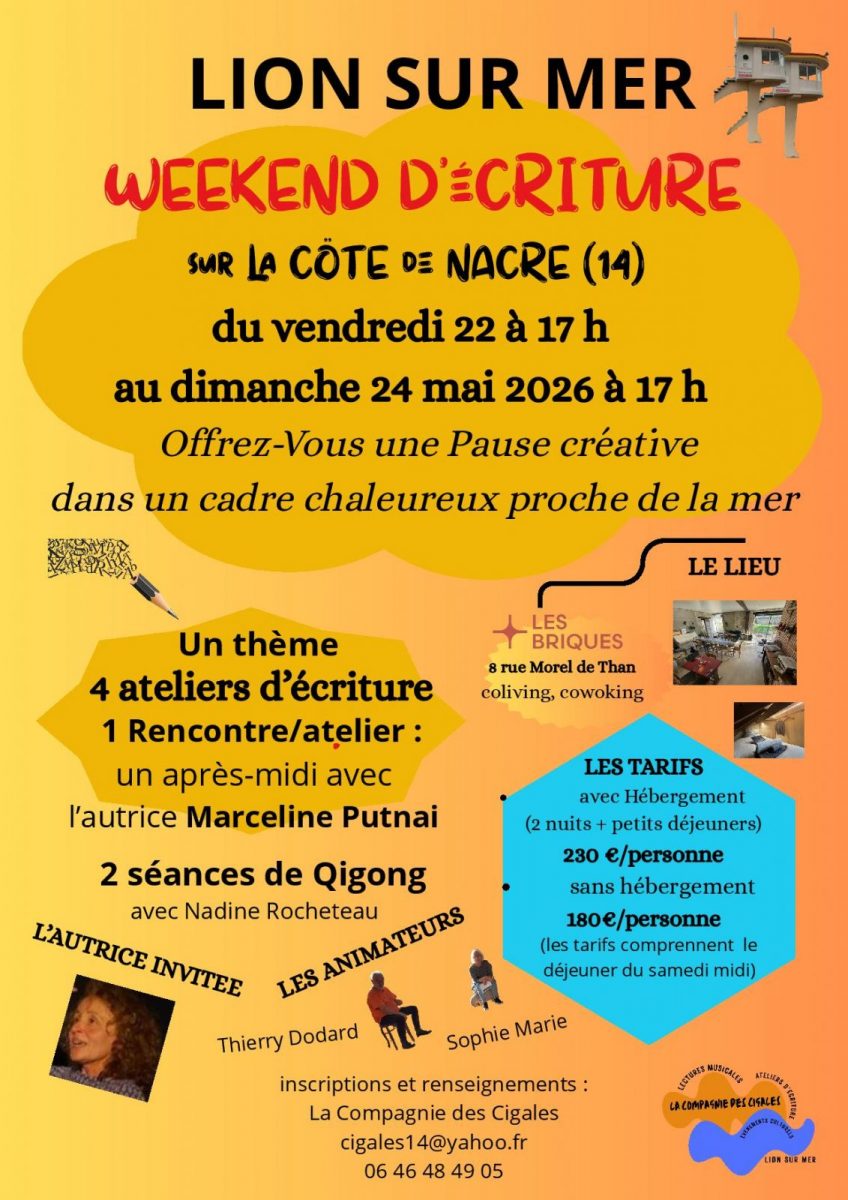 Dans le cadre agréable et paisible, et pas loin de la mer, des Briques à Lion sur mer : 4 ateliers, 1 autrice invitée, Marceline Putnai, 2 séances de Qi Gong. Et en bonus le samedi soir, une lecture musicale par "Les Zélé(e)s du Vocal".