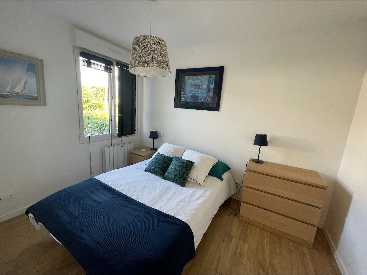 Une chambre avec un grand lit (160x200 – matelas Emma) et un lit individuel (90x190) avec une grande commode.