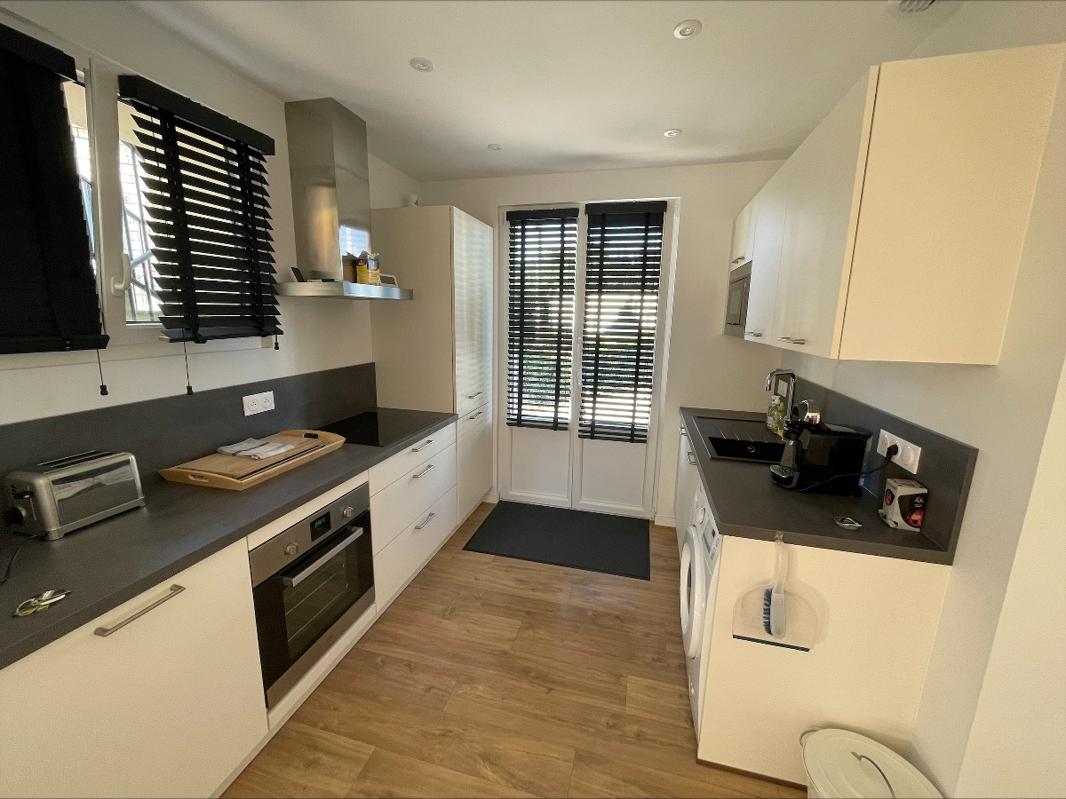 Une cuisine aménagée et totalement équipée (four, micro-ondes, plaques induction, hotte, frigo, congélateur, lave vaisselle, tassimo, grille pains).