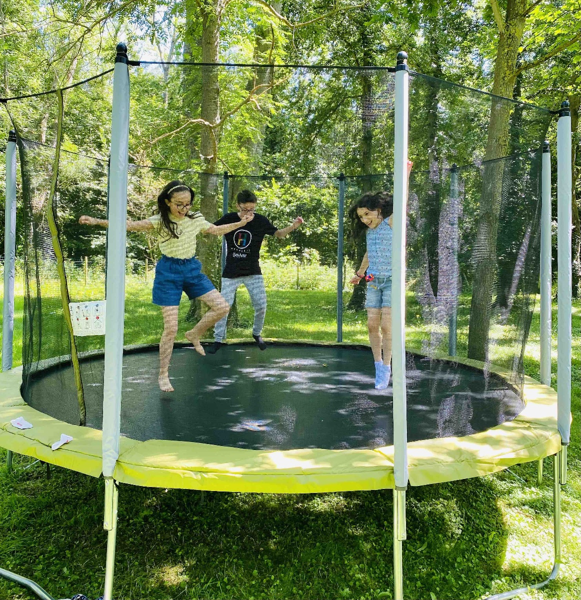 Un grand trampoline, un stand de fléchettes, tir à l'arc, panier de basket, base-ball.