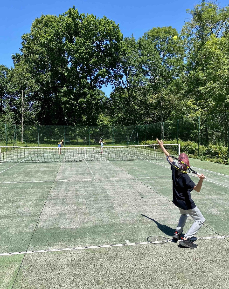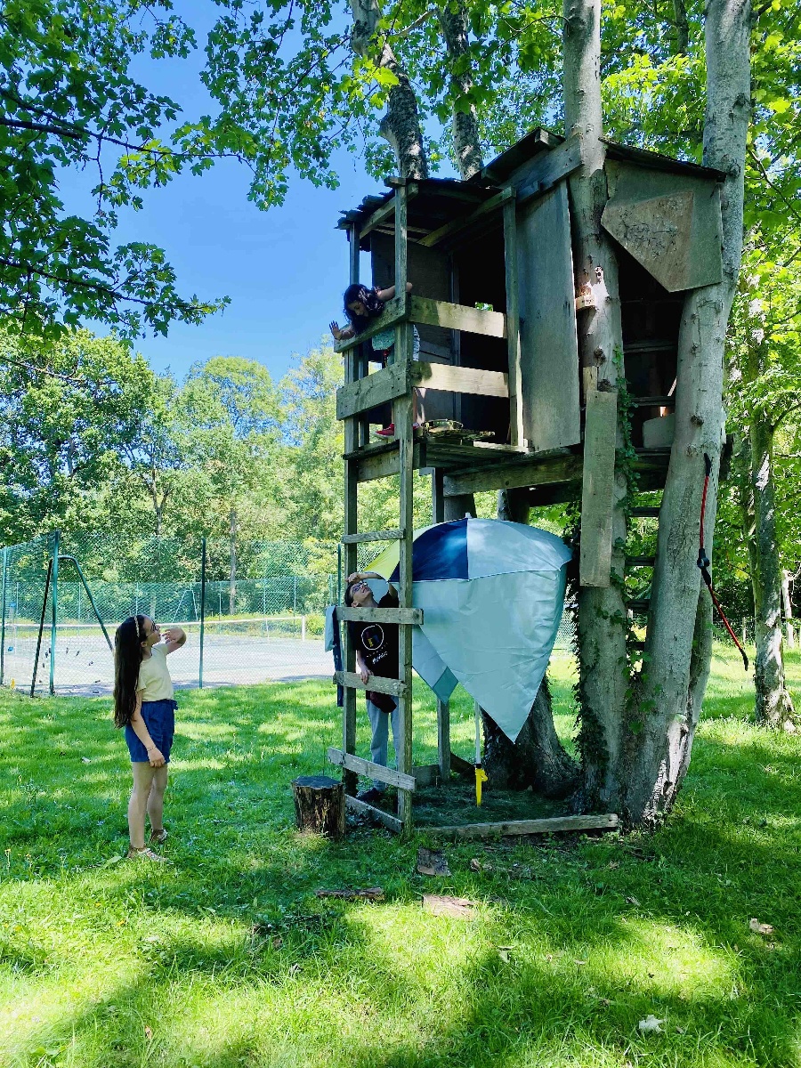 Une cabane en bois dans les arbres, un terrain de tennis/volley-ball/badminton/pétanque/foot.