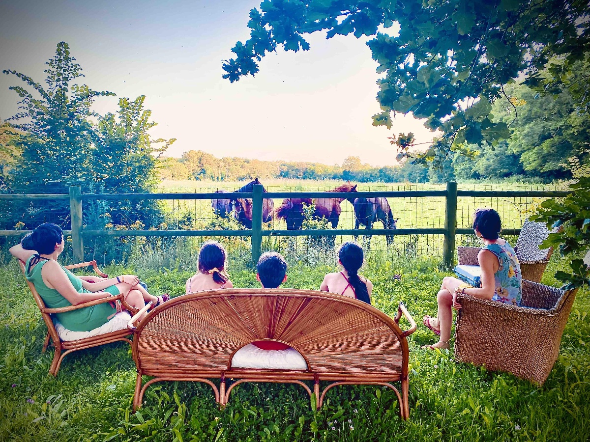 La vue domine un pré à chevaux et le Bois du Caprice. Le parc vous offre un accès direct pour un départ de randonnée dans le Bois du Caprice et en direction de Colleville- Montgomery.