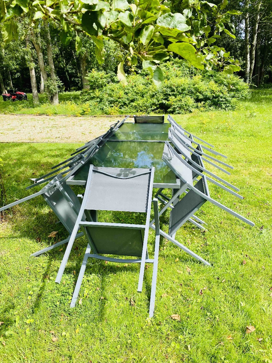 Vous bénéficiez d’une terrasse avec une grande table pouvant accueillir 10 personnes, ainsi que des transats.