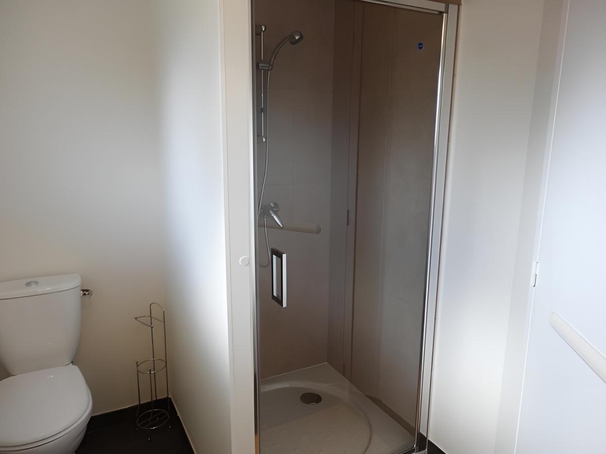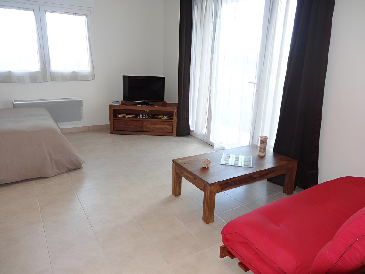 Grande pièce avec un espace couchage (1 lit 140x190 et 1 lit 80x190), canapé et TV, un espace cuisine aménagée et salle à manger, salle d'eau avec WC.