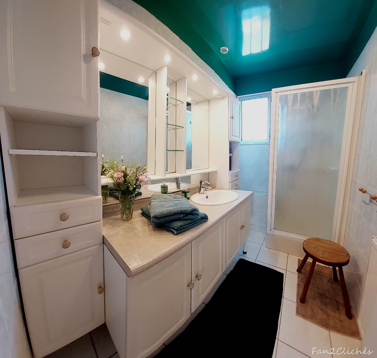 - SALLE DE BAIN : Une salle d'eau avec cabine de douche et rangements. La cabine de douche ne fait pas partie des éléments rénovés.