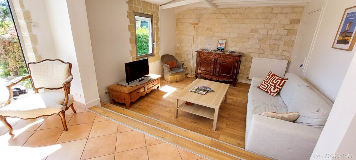 - SALON : Salon cosy en contrebas, avec canapé confortable, table basse et écran plat pour vos moments de partage ou de détente.