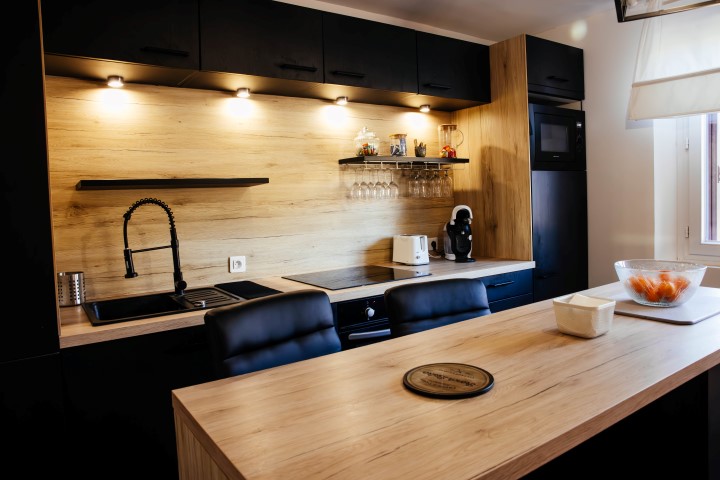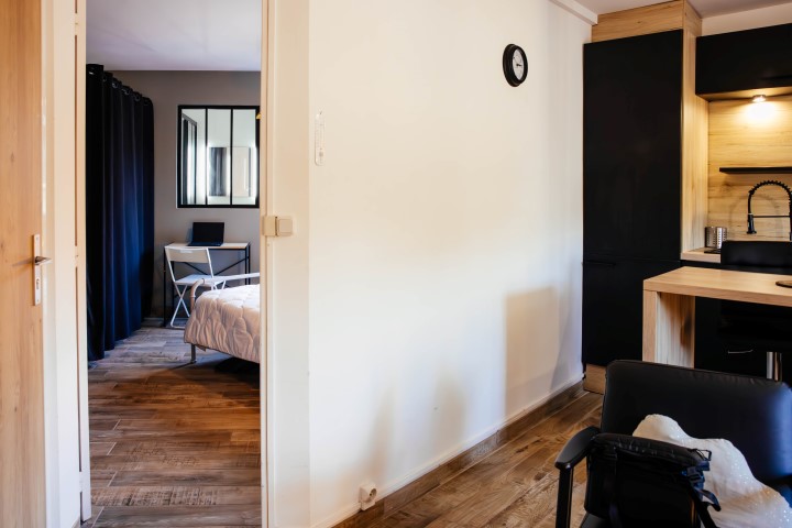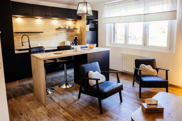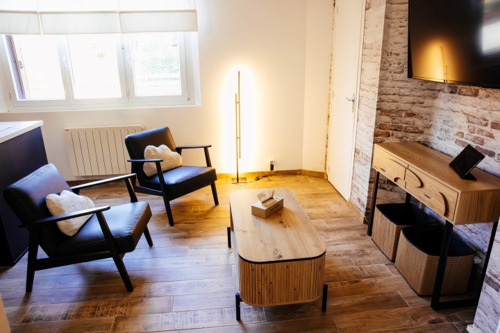 La pièce à vivre se compose d’une cuisine équipée d’un réfrigérateur, de plaques à induction, four, micro-ondes, lave-vaisselle, lave linge et d’un espace salon avec fauteuils, Smart télévision et réseau Wifi.