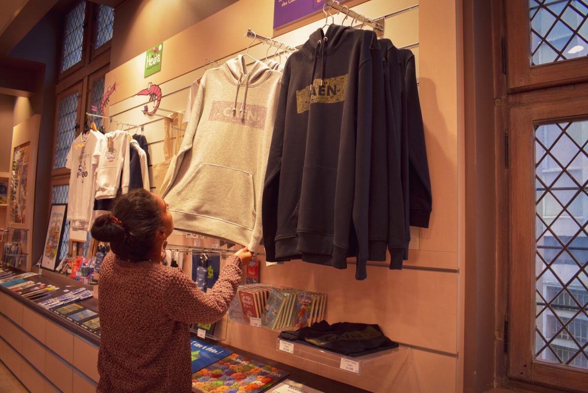 Pour emporter un petit bout de Caen avec soi, nous faisons un tour à la boutique souvenir de l’Office de Tourisme. On y déniche des affiches originales de la ville, t-shirts collectors et autres produits faisant référence à la capitale normande.
