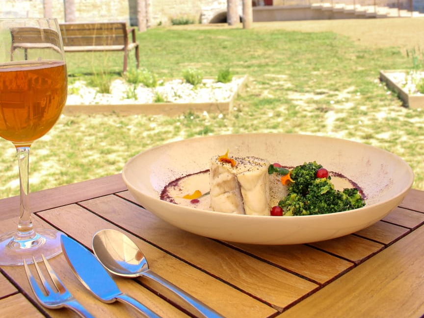L'établissement possède une salle d'une capacité de 120 couverts, deux terrasses donnant l'une sur la cour du château et l'église Saint George et l'autre sur le jardin des statues.