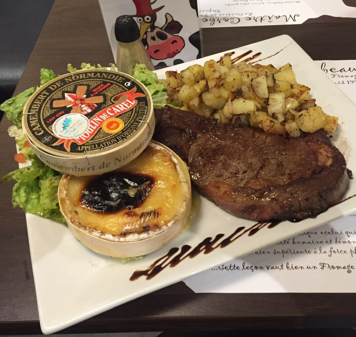 Dans un décor chaleureux et champêtre, où tous les objets sont là pour vous faire voyager au pays des vaches et du lait, venez déguster des plats savoureux préparés avec des fromages de qualité.