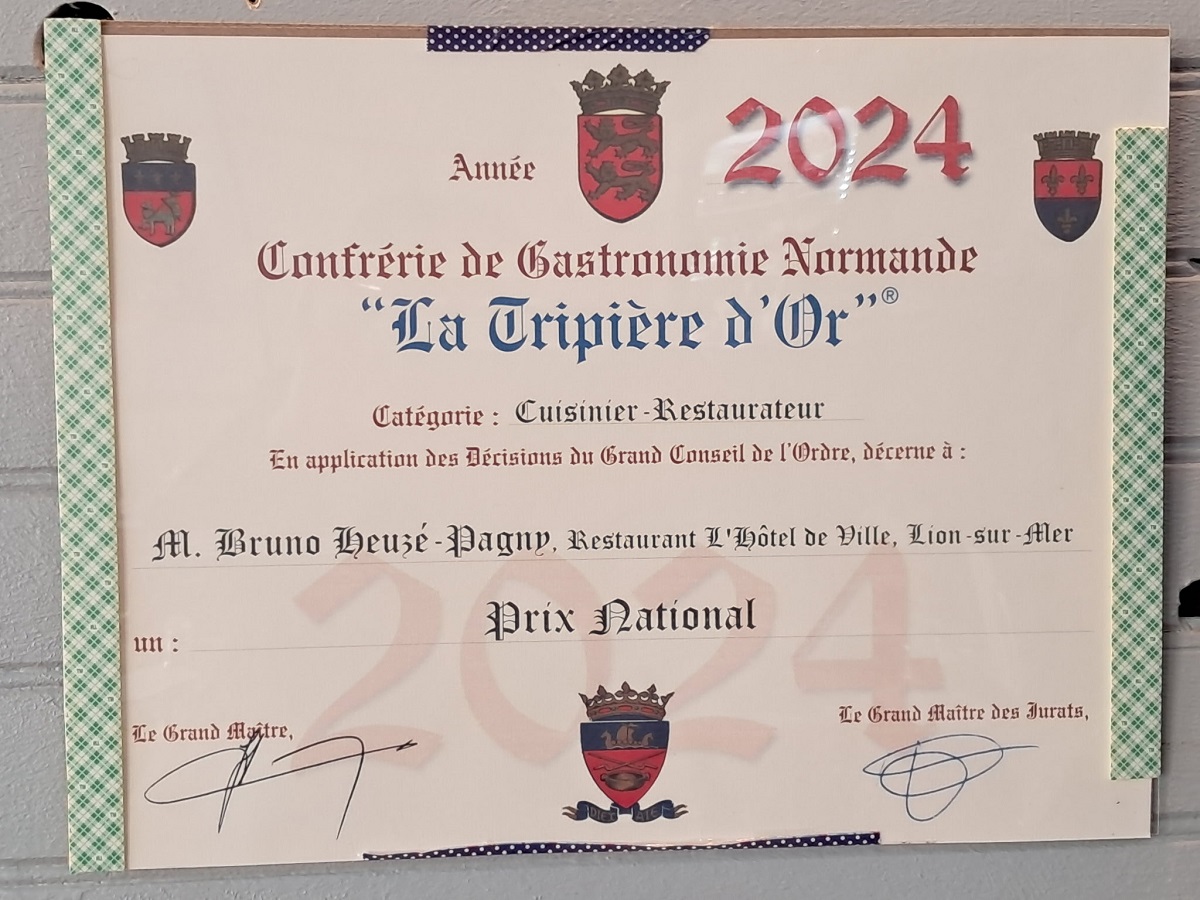 Le Chef s'est vu décerner le Prix National de Tripes en 2023,2024 et 2025 par la Confrérie Normande de la Tripière d'Or. N'hésitez pas à commander vos portions de tripes à emporter !
